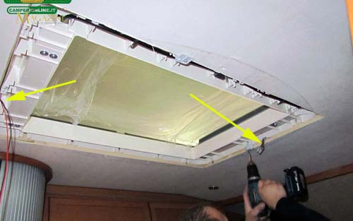 Si provvede ad avvitare le viti sulle staffe presenti lungo il perimetro dell’oblò: sono loro che assicurano il corretto fissaggio sul tetto. Le frecce gialle indicano i cavi che servono ad alimentare l’illuminazione integrata dell’oblò.