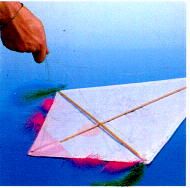 Questi fili si incrocieranno nel punto indicato in foto, nel quale si legherà un altro filo, quello per sostenere l’aquilone.