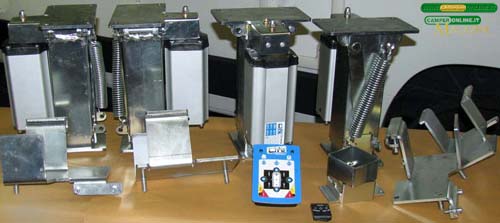 Ecco un piedino a montaggio ultimato nella sua normale posizione di riposo. Sono due i movimenti a cui sarà sottoposto: di ribaltamento, dalla posizione di riposo a quella di lavoro, e di allungamento, per le normali operazioni di livellamento.