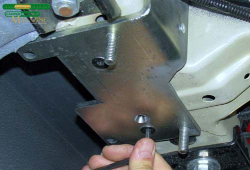 Per prima cosa occorre installare le staffe in dotazione sfruttando i numerosi fori esistenti nel telaio del Fiat Ducato. Nel kit sono compresi anche i bulloni e la minuteria necessari ad un corretto montaggio e l’unica attenzione deve essere rivolta all’ingombro e alla libertà di movimento, requisiti necessari ad evitare possibili interferenze con altri organi meccanici. Nella foto una staffa per i piedini posteriori.