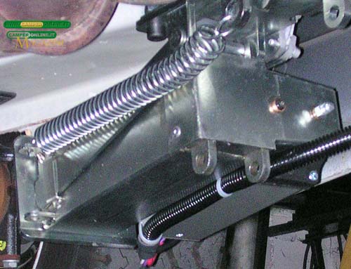 Ecco i piedini in azione. L’estensione totale è di 160 mm e l’altezza totale è adattabile con opportuni distanziali a 300, 360 e 420 mm. Per evitare possibili torsioni al telaio i piedini vengono azionati sempre in coppia: assale anteriore o posteriore, lato destro o sinistro.