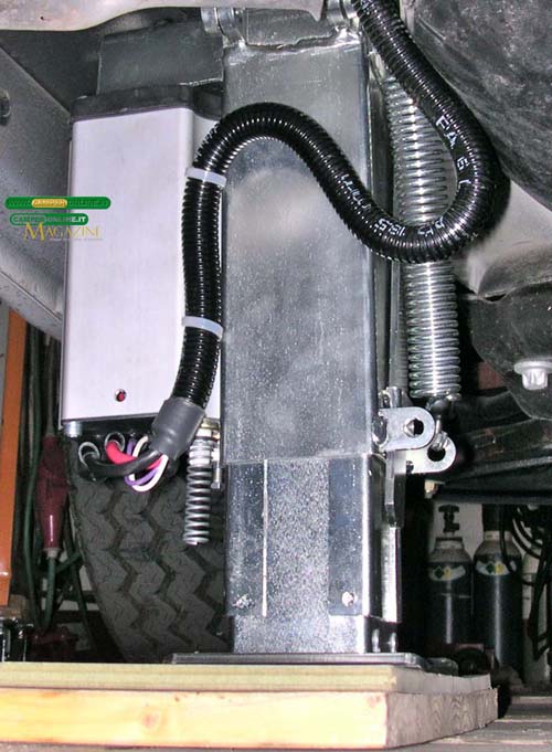 La centralina di controllo viene fornita completa di guaine flessibili e cavi elettrici già cablati. Nella foto che segue si può vedere la centralina installata sotto al pianale del veicolo. Per un corretto funzionamento dei suoi sensori è importante che risulti perfettamente allineata con l’asse longitudinale del veicolo.
