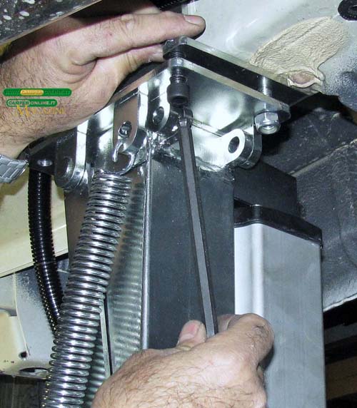 Nell’immagine successiva il tecnico sta provvedendo al serraggio dei bulloni con testa a brugola. Si può notare il piedino in posizione di montaggio dopo che è stata verificata l’assenza di possibili interferenze.