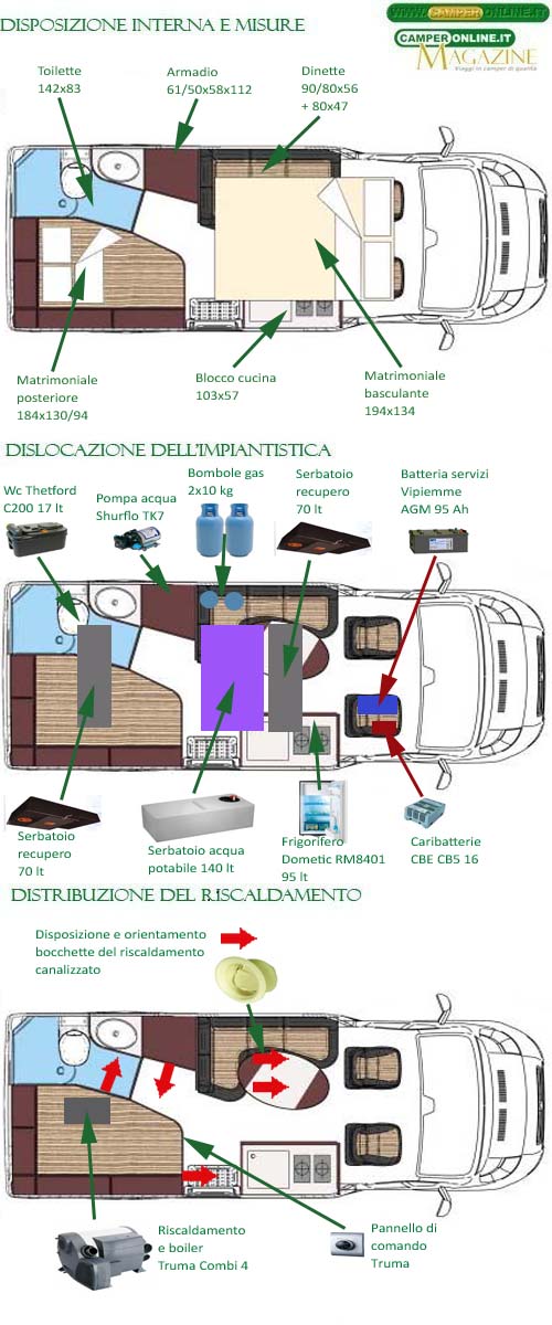 Per il riscaldamento e la produzione di acqua calda è stata prevista una stufa Truma Combi 4 da 4 kW con boiler integrato. È alloggiata all’interno del gavone ricavato sotto al matrimoniale longitudinale e protetta da apposita copertura dotata di griglie di aerazione. Da segnalare, come all’interno del gavone tutte le canalizzazioni siano opportunamente protette dagli eventuali urti da appositi carter. L’impianto di aria canalizzata serve in totale 5 bocchette di ventilazione, a cui sono da sommarsi le tre che servono i serbatoi dell’acqua potabile e di recupero.