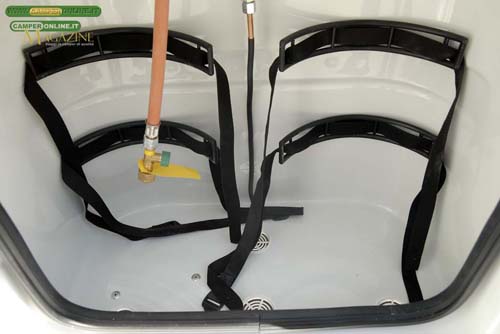 A centro veicolo, in corrispondenza del blocco cucina, è invece alloggiato il gavone che ospita le due bombole del gas da 10 kg. Il vano misura 65x30x61 cm, con una apertura utile di 54×53 cm, ed è posto ad una altezza di 46 cm dal suolo. È interamente realizzato in vetroresina e dispone sul fondo di 4 griglie per l’aerazione da 5,5 cm di diametro.
