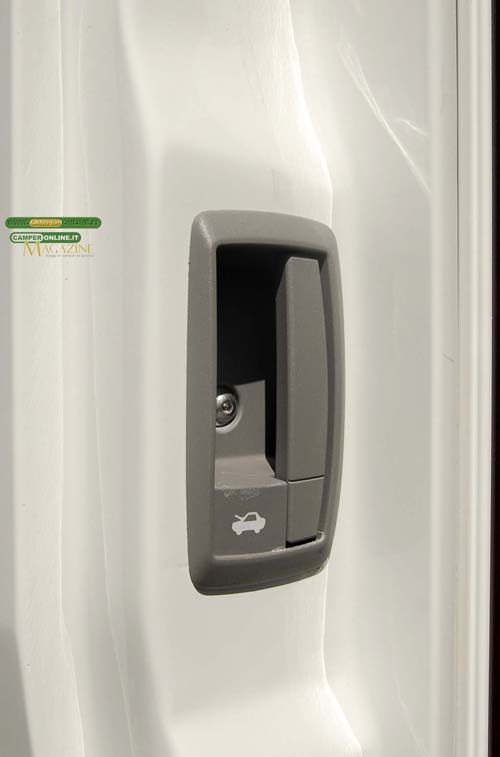 Non meno importante, sia dal punto di vista della tecnica costruttiva sia in merito al risultato estetico, la realizzazione della porta e degli sportelli dei gavoni. Sono infatti assenti le cornici perimetrali, e con queste le viti di fissaggio e i conseguenti fori nella scocca, da sempre possibili vie di entrata per l’acqua. Le battute, realizzate direttamente a stampo, meritano una citazione, vista l’accurata realizzazione e l’altrettanto preciso accoppiamento. Da segnalare anche le eccellenti cerniere a scomparsa T.HI.R.D., le serrature di tipo automobilistico, cosi come i comandi per l’apertura dei vari portelli dei gavoni, sistemati all’interno del veicolo, come da migliore tradizione automotive. Stilisticamente il risultato è apprezzabile ed esce dai consueti canoni, con un piacevole alternarsi di linee morbide ed altre leggermente più tese, sempre nel pieno rispetto dei rapporti di volume.