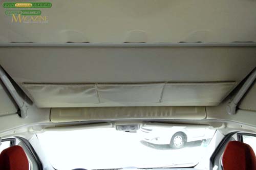 Il passaggio verso l’abitacolo è buono, con una larghezza tra i braccioli di 24 cm, e il letto basculante, vista la sua notevole inclinazione verso il parabrezza, non penalizza in alcun modo lo spazio in altezza. Di ottima fattura, infine, l’integrazione con il cupolino, realizzata tramite appositi manufatti in vetroresina in gran parte rivestiti da inserti imbottiti, tra cui spicca quello che riporta il nome del marchio. Tre comode tasche portaoggetti sono sistemate nella parte inferiore del letto basculante.