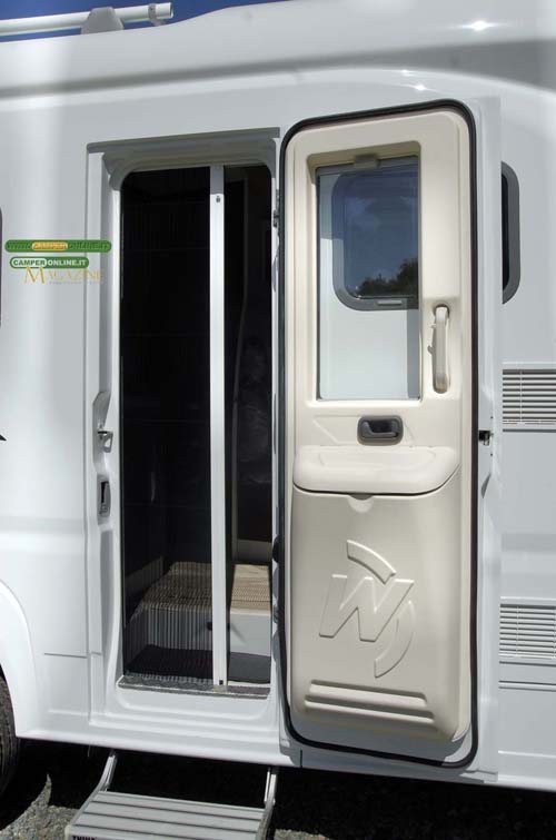 La porta di accesso, corredata di controporta zanzariera e situata in posizione baricentrica sulla fiancata, è realizzata direttamente da Wingamm in vetroresina e si merita un approfondimento. Come detto in precedenza, la battuta è ricavata direttamente a stampo e rivela una lavorazione impeccabile, con una precisione negli accoppiamenti non usuali nei manufatti in fibra di vetro e resina. La serratura è di tipo automobilistico con chiusura centralizzata e il solo punto di chiusura non tragga in inganno, vista la notevole robustezza dell’intera struttura.