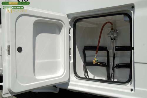 A centro veicolo, in corrispondenza del blocco cucina, è invece alloggiato il gavone che ospita le due bombole del gas da 10 kg. Il vano misura 65x30x61 cm, con una apertura utile di 54×53 cm, ed è posto ad una altezza di 46 cm dal suolo. È interamente realizzato in vetroresina e dispone sul fondo di 4 griglie per l’aerazione da 5,5 cm di diametro.