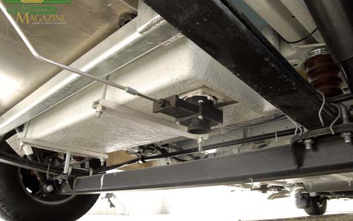 A centro veicolo, in corrispondenza del blocco cucina, è invece alloggiato il gavone che ospita le due bombole del gas da 10 kg. Il vano misura 65x30x61 cm, con una apertura utile di 54×53 cm, ed è posto ad una altezza di 46 cm dal suolo. È interamente realizzato in vetroresina e dispone sul fondo di 4 griglie per l’aerazione da 5,5 cm di diametro.Sono presenti le consuete staffe sagomate con cinghie per il fissaggio delle bombole e l’interruttore inerziale Secumotion. Anche in questo caso le cerniere sono del tipo T.HI.R.D. e il comando per l’apertura a distanza è posizionato nella battuta della porta sinistra della cabina di guida, insieme a quella del secondo vano sottopianale destinato allo stivaggio.