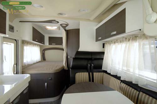 La dinette misura 90/80×56, per quanto riguarda la seduta frontemarcia, e 80×47, per ciò che concerne il segmento longitudinale, con una altezza dal pavimento di 49 cm. La luminosità è assicurata da una finestra Polyvision da 100×50 cm con apertura a compasso, oscurante plissettato, zanzariera e tenda di cortesia.