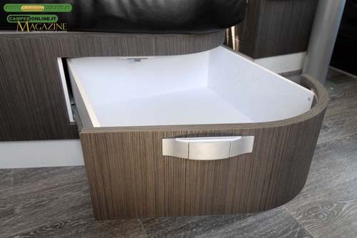 Le due cassapanche sono agibili e i progettisti Wingamm, per evitare la fastidiosa rimozione di cuscini e coperchi, hanno scelto di dotarle entrambe di cassetti, molto più comodi da utilizzarli, anche se inevitabilmente meno capienti. Il più grande, e il più facilmente accessibile, è quello contenuto nella seduta frontemarcia ed è contraddistinto da una pregevole curvatura del frontale. Le sue misure sono di 43x39x14 cm.