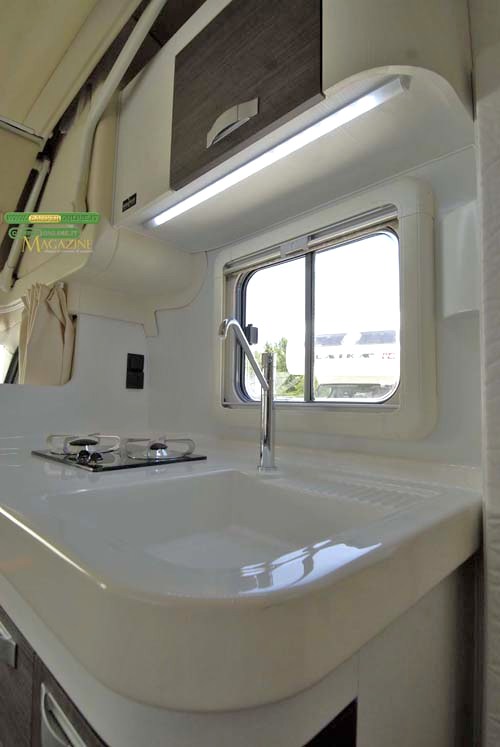 La cucina è alloggiata a ridosso della cabina di guida, di fronte alla dinette e misura 103×57 cm, con una altezza di 90. L’illuminazione naturale è fornita da una finestra a scorrimento Polyvision da 50×40 cm, mentre quella artificiale si affida ad un tubo da 18 led.
