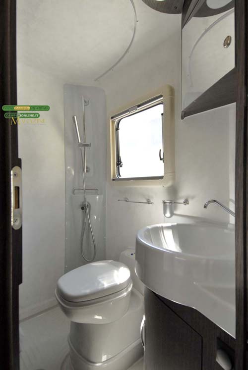 Arredata in legno e con il pavimento in vetroresina che ingloba il piatto doccia, è corredata di Wc Thetford C 200 con tazza girevole e cassetta estraibile da 17 litri e lavabo in vetroresina (diametro di 41 cm e profondità di 15) posto ad una altezza di 78,5 cm dal pavimento.