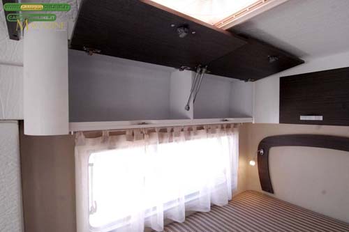 Nella zona anteriore, disposto longitudinalmente, troviamo il matrimoniale basculante, il quale, nonostante la sua collocazione lo porti necessariamente a sovrastare gran parte del living, presenta sotto di sé un’altezza utile di 186 cm e lascia libero accesso ai pensili sottostanti.