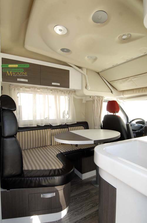 La configurazione per la sosta, invece, grazie ai sedili girevoli della cabina di guida, consente di ottenere una dinette ad L in grado di ospitare quattro, cinque persone intorno al tavolo da 105×70 cm, il cui piano è posto ad una altezza di 76 cm dal pavimento.