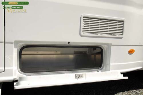 Non meno importante, sia dal punto di vista della tecnica costruttiva sia in merito al risultato estetico, la realizzazione della porta e degli sportelli dei gavoni. Sono infatti assenti le cornici perimetrali, e con queste le viti di fissaggio e i conseguenti fori nella scocca, da sempre possibili vie di entrata per l’acqua. Le battute, realizzate direttamente a stampo, meritano una citazione, vista l’accurata realizzazione e l’altrettanto preciso accoppiamento. Da segnalare anche le eccellenti cerniere a scomparsa T.HI.R.D., le serrature di tipo automobilistico, cosi come i comandi per l’apertura dei vari portelli dei gavoni, sistemati all’interno del veicolo, come da migliore tradizione automotive. Stilisticamente il risultato è apprezzabile ed esce dai consueti canoni, con un piacevole alternarsi di linee morbide ed altre leggermente più tese, sempre nel pieno rispetto dei rapporti di volume.