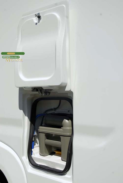 Quest’ultimo, le cui misure sono di 65x29x29 cm, con una apertura utile di 52×20 cm, è posizionato anteriormente vicino alla porta del conducente, ed è sormontato dalla presa per il collegamento alla rete elettrica a 220 Volt e dal bocchettone per il carico dell’acqua potabile.