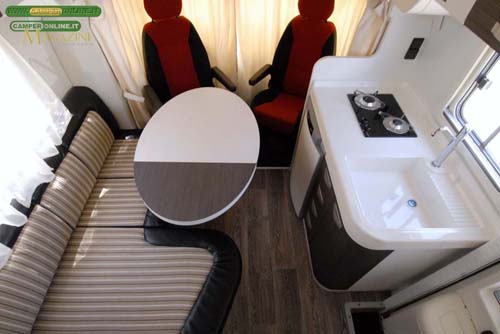La dinette misura 90/80×56, per quanto riguarda la seduta frontemarcia, e 80×47, per ciò che concerne il segmento longitudinale, con una altezza dal pavimento di 49 cm. La luminosità è assicurata da una finestra Polyvision da 100×50 cm con apertura a compasso, oscurante plissettato, zanzariera e tenda di cortesia.