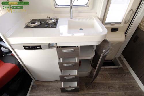 La cucina è alloggiata a ridosso della cabina di guida, di fronte alla dinette e misura 103×57 cm, con una altezza di 90. L’illuminazione naturale è fornita da una finestra a scorrimento Polyvision da 50×40 cm, mentre quella artificiale si affida ad un tubo da 18 led.
