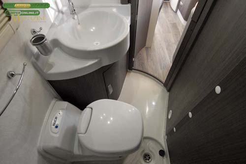 La toilette è posizionata alle spalle del living e sfrutta tutta la parte sinistra del veicolo fino alla parete di coda. Accessibile tramite una porta da 169×45,5 cm, il locale misura 142×83 cm e dispone di finestra Polyvision da 50×50 cm.