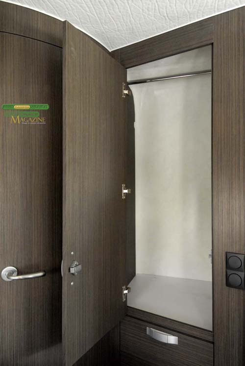 L’armadio per i capi appesi, situato tra il locale toilette e il living, è accessibile tramite un portello da 108×40 cm e misura 58×61/50×112 cm.