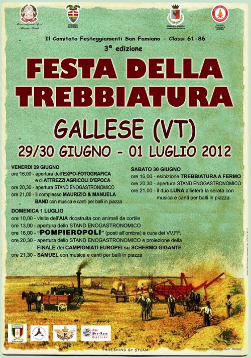 Rispettando parte della sua forma antica, la trebbiatura viene eseguita da una macchina d’epoca azionata da un trattore tramite trasmissione a cinta. Questa rievocazione storica segue un’altra storica usanza, quella della mietitura eseguita in data 16 giugno in località Civetta. I due avvenimenti della tradizione rurale, che oggi rivivono nel presente della città di Gallese ci riportano dietro nel tempo. L’aia allestita per la manifestazione, delimitata in Piazza Don Lorenzo Milani, è riprodotta come un tempo. Attrezzi d’epoca come aratri, assolcatori, falciatrici e ranghinatori mostrano la loro bellezza storica, la funzionalità di un tempo e lo sviluppo tecnologico a partire dagli anni di fine ottocento.