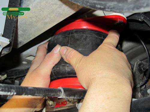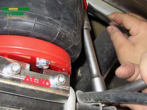 Rimosso il vecchio tampone, non resta che inserire tra la balestra e il longherone del telaio la molla ad aria AirTop della Al-Ko. Superiormente la molla presenta una staffa che si adatta ai fori presenti sul telaio della meccanica, mentre inferiormente dispone di una apposita staffa che andrà installata sotto ai cavallotti che fissano la balestra all’assale posteriore.