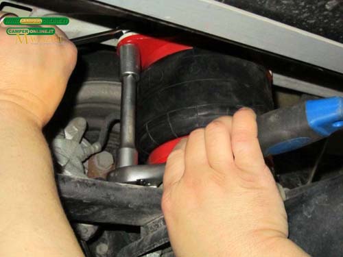Rimosso il vecchio tampone, non resta che inserire tra la balestra e il longherone del telaio la molla ad aria AirTop della Al-Ko. Superiormente la molla presenta una staffa che si adatta ai fori presenti sul telaio della meccanica, mentre inferiormente dispone di una apposita staffa che andrà installata sotto ai cavallotti che fissano la balestra all’assale posteriore.