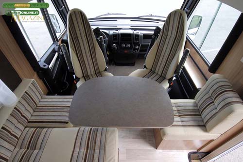 Tra i compatti figurano anche l’integrale G600LGA e il profilato P600LGA, entrambi con lunghezza di 599 cm e con disposizione interna particolarmente indicata al nostro mercato, grazie al matrimoniale trasversale su garage. Identica ai modelli precedenti la soluzione offerta dal living, mentre differisce ovviamente la posizione della toilette con box doccia separata, in questo caso sistemata centralmente alle spalle della dinette.