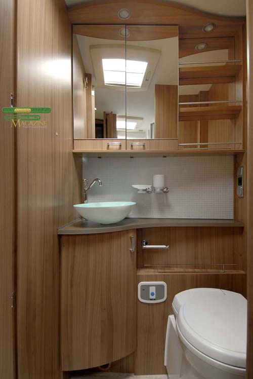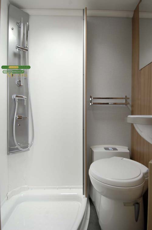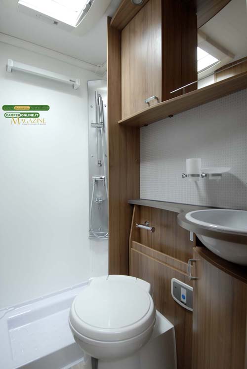 Il motorhome G691LGE con matrimoniale trasversale su garage è ora con toilette e doccia in vani separati e autonomi.