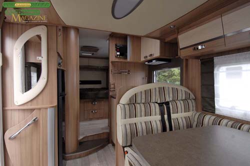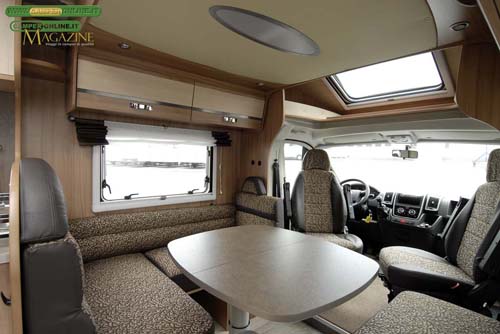 Più lungo (744 cm) il P736LCR con letto a penisola di derivazione nautica, dinette angolare e divanetto laterale, cucina a L e toilette e doccia in vani indipendenti.