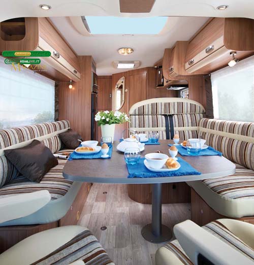 Tra i compatti figurano anche l’integrale G600LGA e il profilato P600LGA, entrambi con lunghezza di 599 cm e con disposizione interna particolarmente indicata al nostro mercato, grazie al matrimoniale trasversale su garage. Identica ai modelli precedenti la soluzione offerta dal living, mentre differisce ovviamente la posizione della toilette con box doccia separata, in questo caso sistemata centralmente alle spalle della dinette.