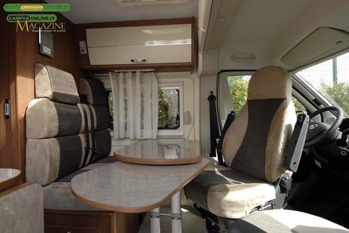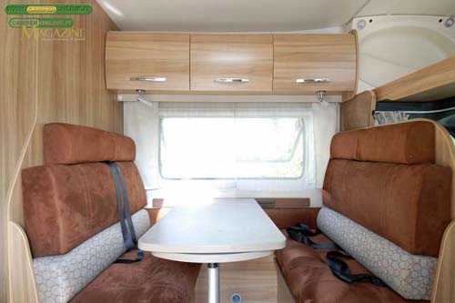 Il soggiorno si affida ad una semidinette con tavolo ampliabile, il blocco cucina è alloggiato nel vano del portellone laterale, mentre la toilette è a centro veicolo, alle spalle del living.