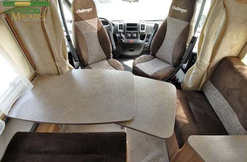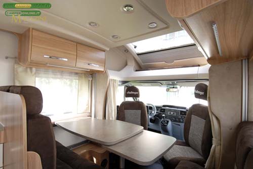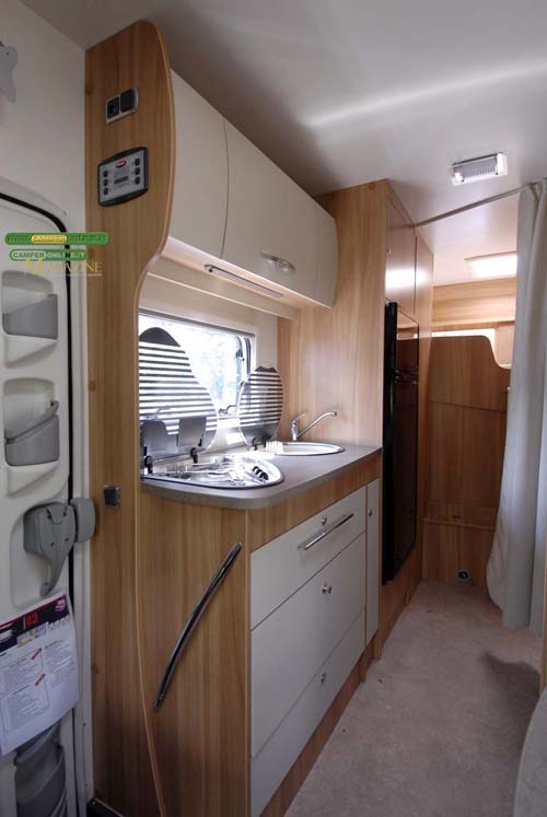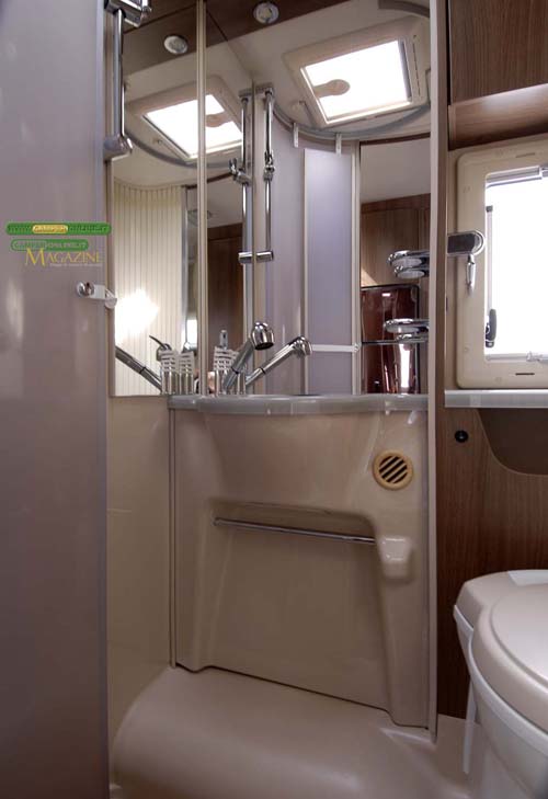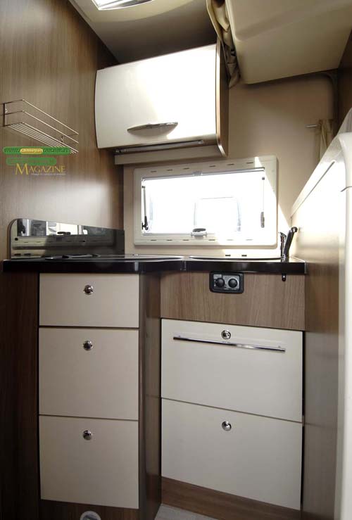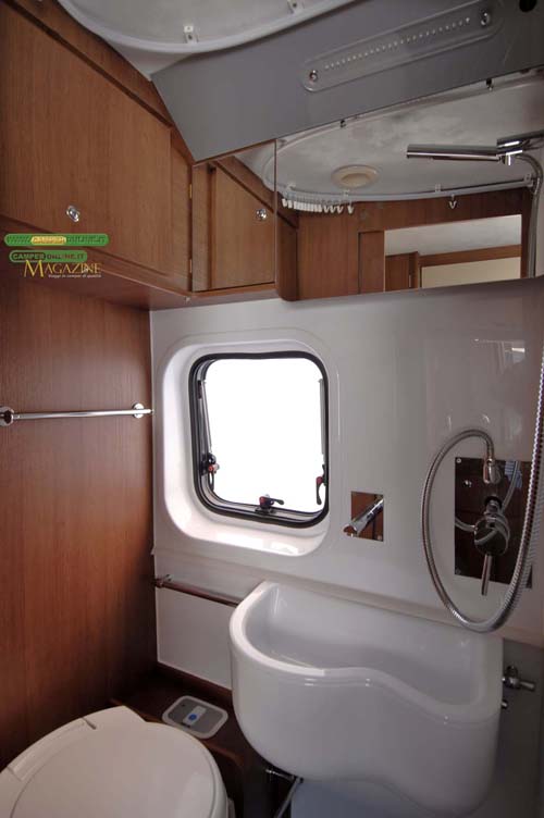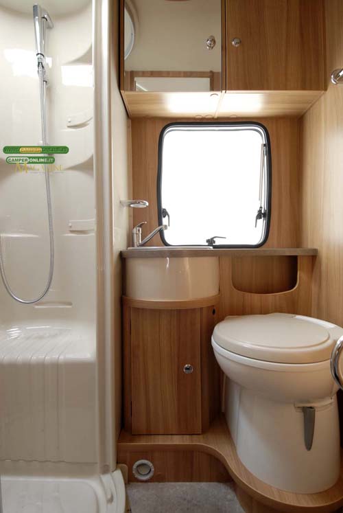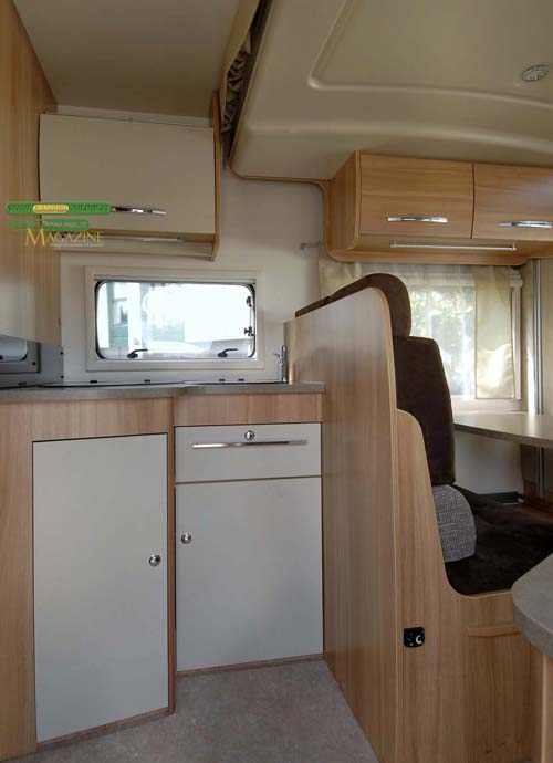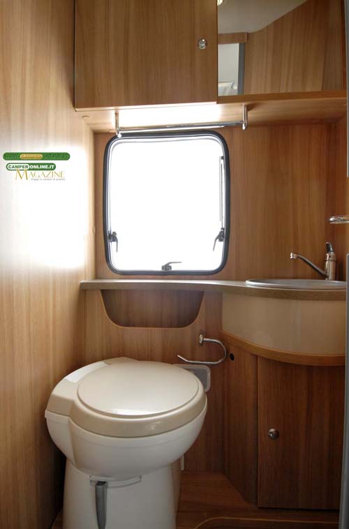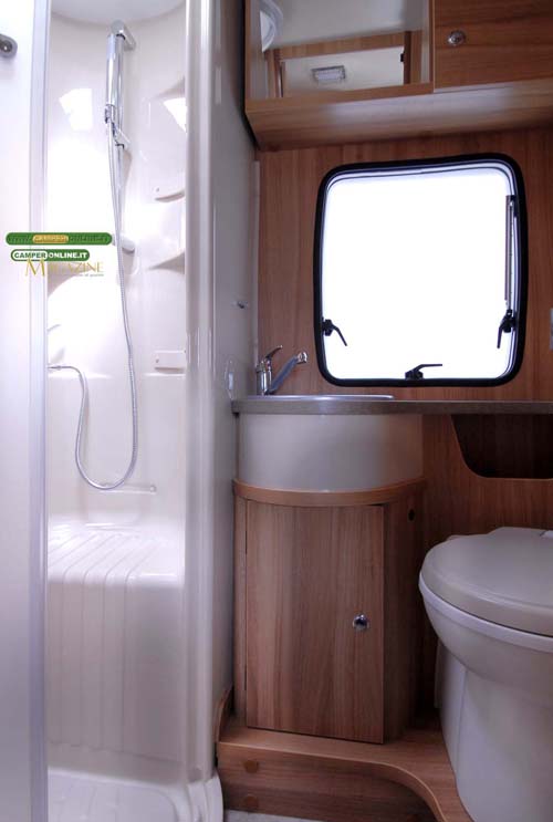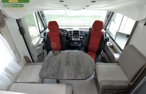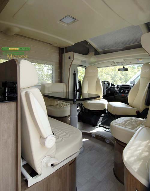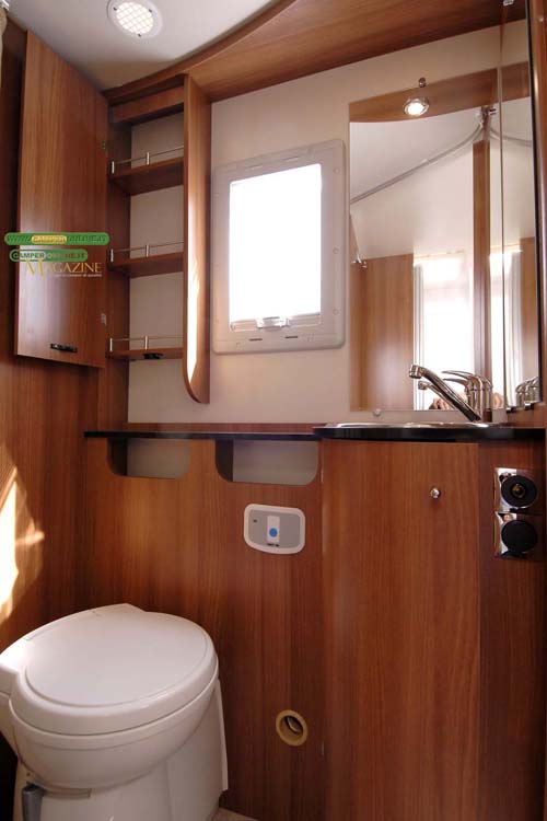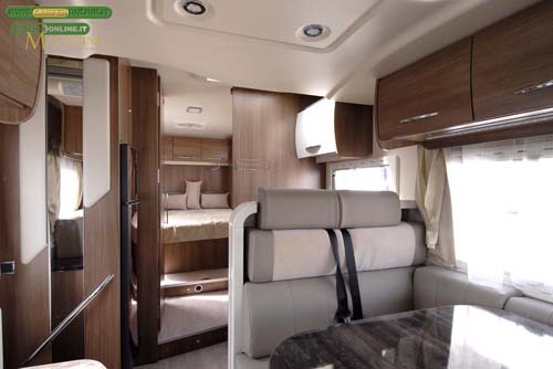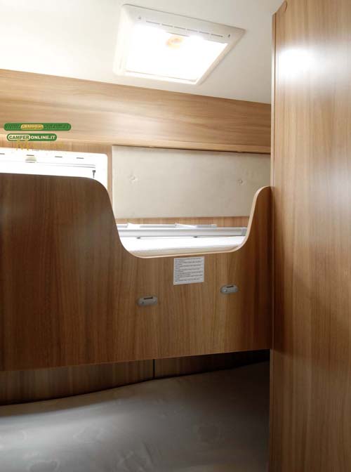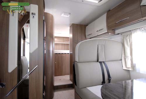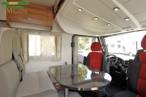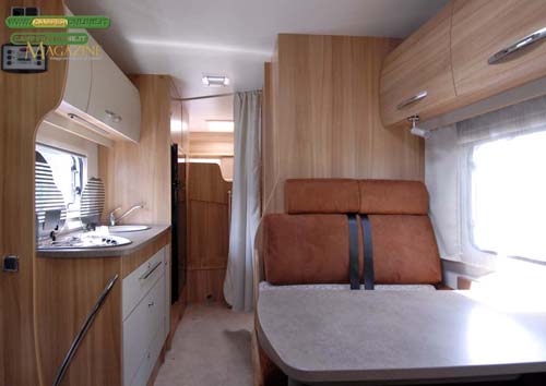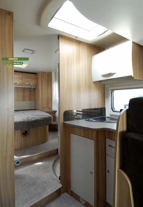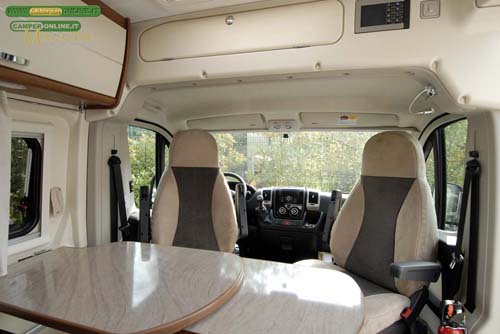 Il mobilio è disponibile in due diverse tonalità di colore, con i cassetti della cucina a chiusura frenata, lo specchio sistemato a fianco della porta di ingresso è retroilluminato e le porte scorrevoli della toilette sono laccate; inoltre l’oblò dispone di stendi-biancheria a ribalta. Il frigorifero è da 190 litri con cella freezer da 35 litri e la porta del conducente dispone di gocciolatoio e di interruttore ad impulso per l’alzacristallo elettrico.