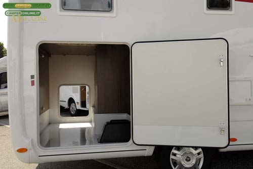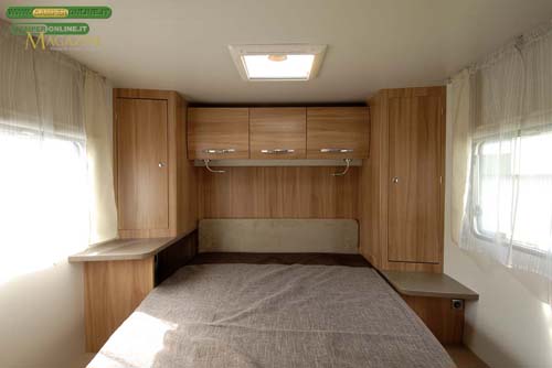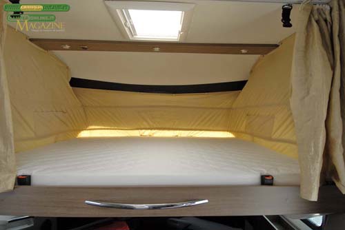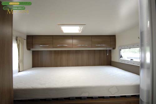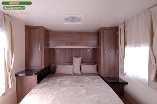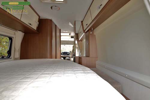 Ampio lo spazio laterale di cui gode il matrimoniale, interamente circondato da pensili e accessibile anche dal doppio portellone posteriore.