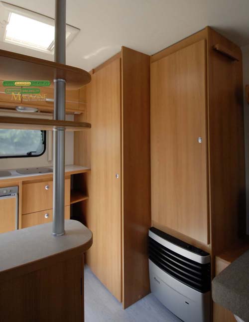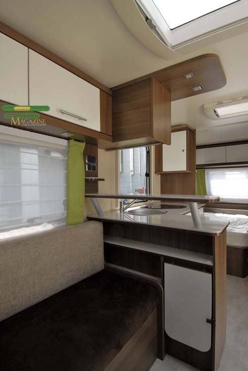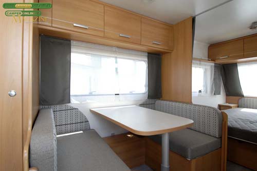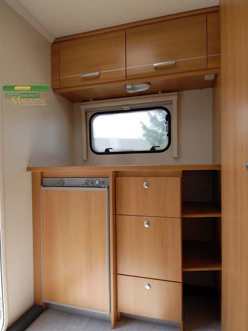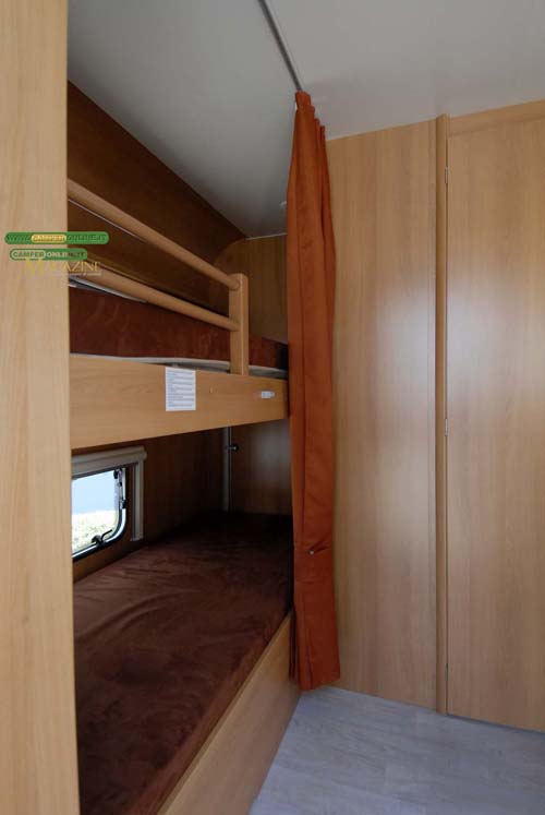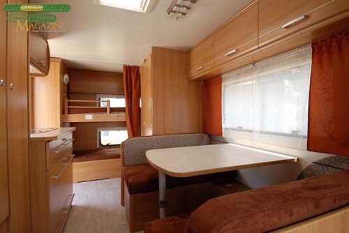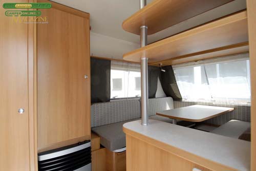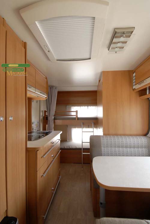 La Antares Luxe 526 adotta il nuovo frigorifero a cassetto XL Freeze e vede pertanto un leggero aggiornamento al layout. Immutata la dinette di tipo classico, così come restano invariati il matrimoniale trasversale e i letti a castello in coda.