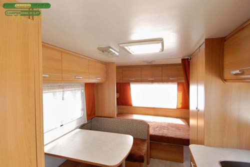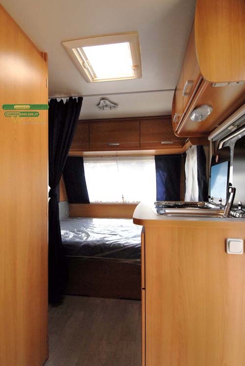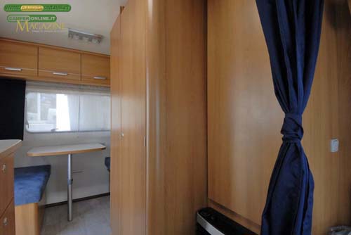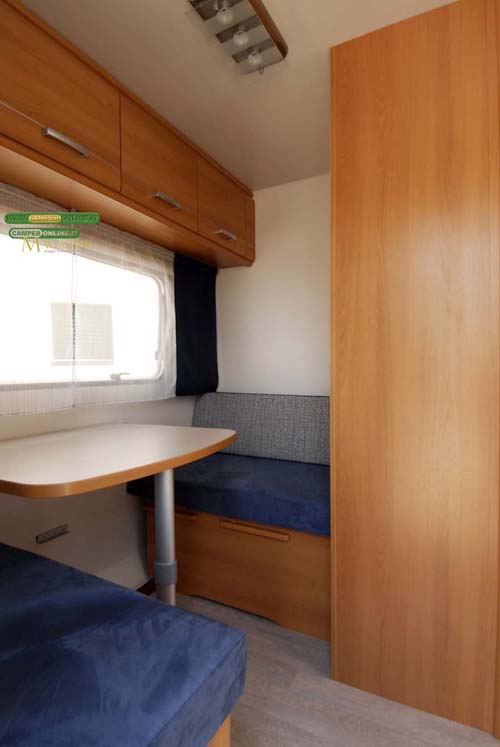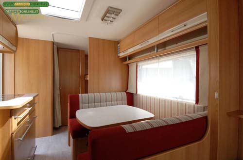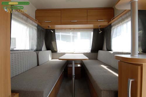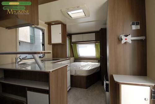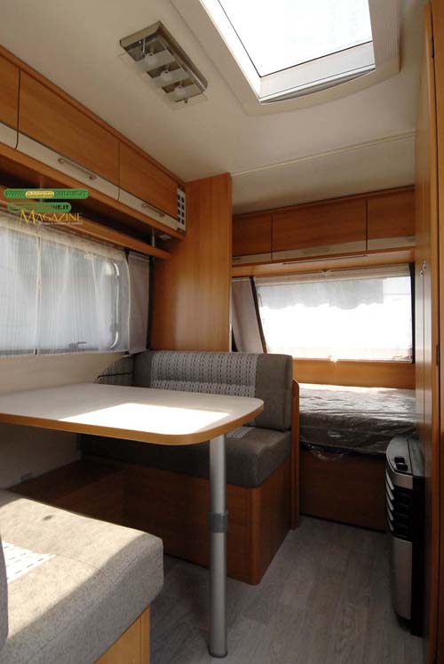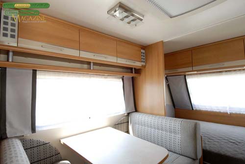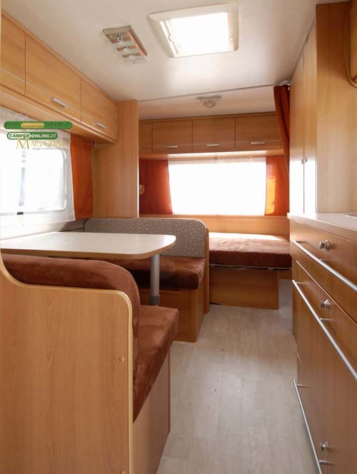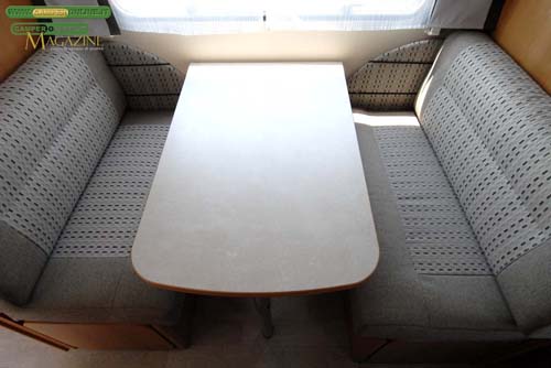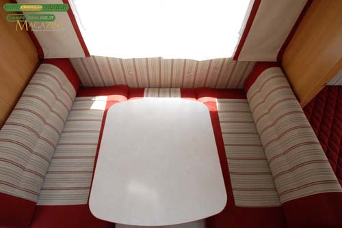 Altro modello inedito lo troviamo nella 380, caravan con matrimoniale trasversale nella zona anteriore e living a divanetti longitudinali contrapposti in coda.