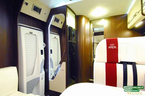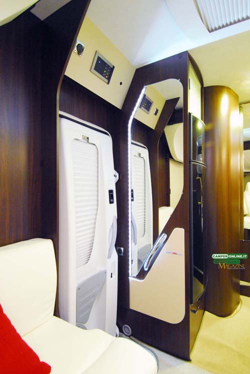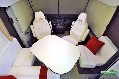 Identico invece il soggiorno anteriore, composto da dinette angolare e divanetto a lato, così come sono uguali la cucina, disposta ad L alle spalle della dinette, e il vano toilette e la doccia, in vani separati e autonomi. Il veicolo è omologato per quattro persone in viaggio e dispone di altrettanti posti a letto, grazie al letto basculante anteriore e al matrimoniale trasversale su garage in coda, mentre il living offre convivialità a cinque persone.