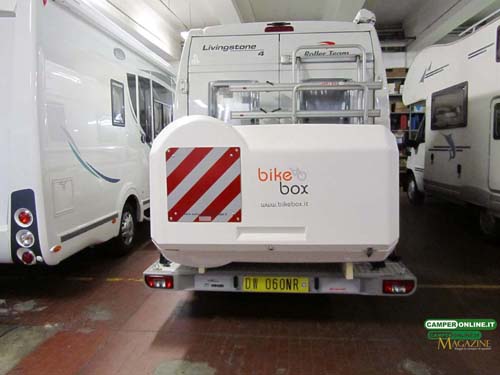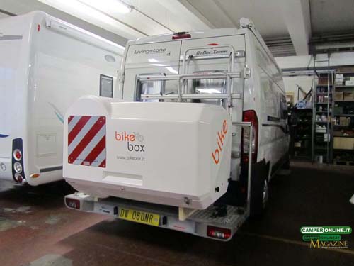Il Bike Box della torinese TST Engineering, un vero e proprio garage esterno costituito da due gusci in vetroresina rinforzata con inserti in alluminio e rifinita esternamente con gelcoat, va installato, tramite il telaio in alluminio anodizzato di cui dispone, sulla parete di coda del veicolo sugli appositi supporti dei normali portabiciclette o sulla base dei portamoto. Di serie è già corredato di cartello regolamentare per la segnalazione del carico sporgente.