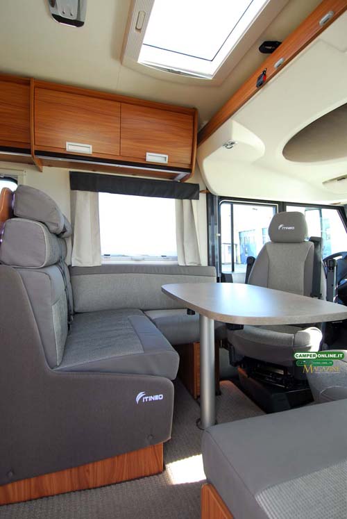 Le poltrone sono quelle originali Fiat e dispongono di piastre girevoli Isri, poggiatesta, braccioli, diverse possibilità di regolazione e fodere coordinate con il logo griffato, quest’ultime comprese nel Pack Itineo. Il varco libero tra i sedili è di 180×28 cm. Le due alette parasole sono inglobate nel rivestimento inferiore del basculante, mentre per ciò che concerne lo stivaggio è presente un vano da 70x19x19 cm sistemato lateralmente alla poltrona di destra.