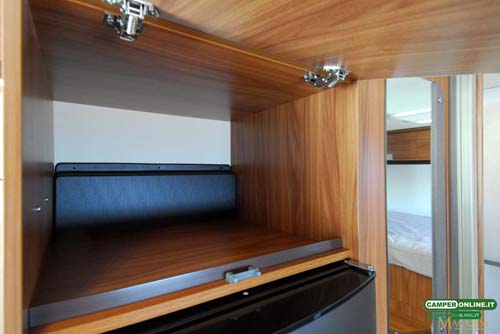 Opposta alla cucina e adiacente alla porta di ingresso è alloggiata la colonna frigo: ospita il frigorifero Thetford N3150 da 150 litri, a sua volta sormontato dal vano che può ospitare il forno (optional) e da quello per la Tv.