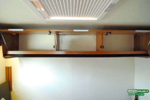 Il matrimoniale basculante è accessibile attraverso la consueta scaletta pioli in alluminio anodizzato e dispone di tende perimetrali in tessuto plissettato e di rete anticaduta. Il fermo di sicurezza durante la marcia è assicurato dalla classica cintura di sicurezza.