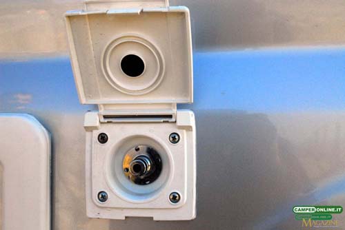 Sulla fiancata sinistra, oltre al vano della cassetta estraibile del Wc Thetford C200, sono installate la presa per il collegamento alla rete elettrica a 220 Volt e un raccordo ad innesto rapido per il rifornimento idrico.