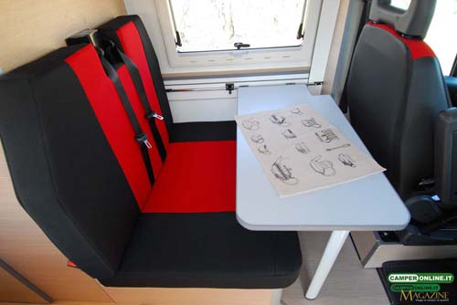 Le cuscinerie della semidinette possono contare su imbottiture in gommapiuma da 11 cm di spessore, mentre le tappezzerie sono realizzate in stoffa bicolore che riprende le tinte dei sedili della cabina di guida.