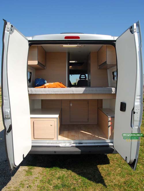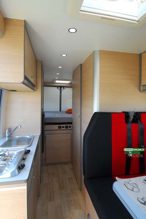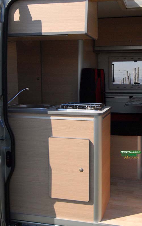 La soglia di ingresso è situata a 49 cm da terra e non dispone di alcun scalino esterno. Nel vano del portellone è alloggiato il blocco cucina, soluzione tra le più diffuse su veicoli di questa categoria.