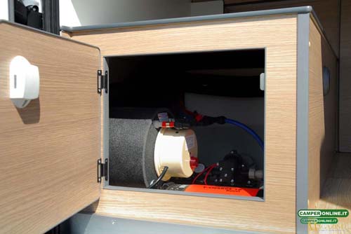 La produzione di acqua calda sanitaria, invece, è affidata ad un boiler Elgena KB 6: alimentato a 12 Volt con una potenza riscaldante di 200 Watt, ha una capacità di sei litri ed è collocato posteriormente, vicino alla pompa dell’acqua e al serbatoio da 150 litri. È accessibile tramite un portello posteriore da 35×30 cm e può essere azionato tramite apposito comando presente sul pannello di controllo CBE.