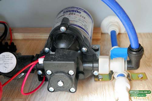 L’impianto idrico, realizzato sfruttando tubazioni in rilsan con innesti rapidi John-Guest, è servito da una pompa a pressostato Shurflo Trail King 7 in grado di erogare fino a 7 litri di acqua al minuto. Quest’ultima, collocata a ridosso del serbatoio, è accessibile sfruttando il portello posteriore ed è ancorata al pavimento e corredata dell’apposito filtro, facilmente accessibile. Un apposito rubinetto consente di scaricare completamente il serbatoio.