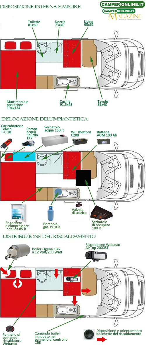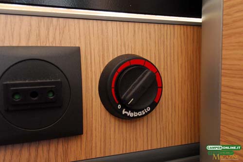 Il riscaldamento è affidato ad un bruciatore Webasto AirTop 2000ST installato nella cassapanca della semidinette e accessibile, sul veicolo in prova, solamente asportando il coperchio in legno che risulta fissato con viti (scelta del cliente). Il riscaldatore è alimentato direttamente dal serbatoio di combustibile del veicolo ed è in grado di produrre un flusso d’aria di 93 mc/ora distribuito attraverso cinque bocchette. L’aspirazione dell’aria è consentita da una presa d’aria sistemata sulla cassapanca, mentre lo scarico è affidato al consueto silenziatore installato nel sottoscocca, in corrispondenza del living.
