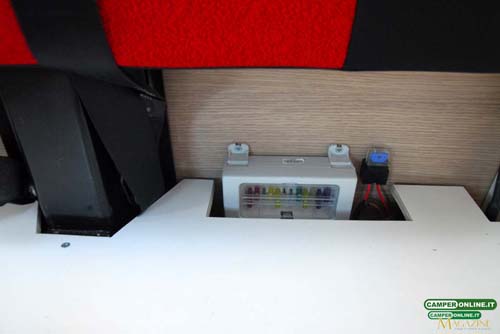 La batteria dei servizi è inserita all’interno della cassapanca del living e risulta accessibile solo svitando il coperchio in legno che la ricopre. Qui è anche installato il quadro di distribuzione con fusibili.